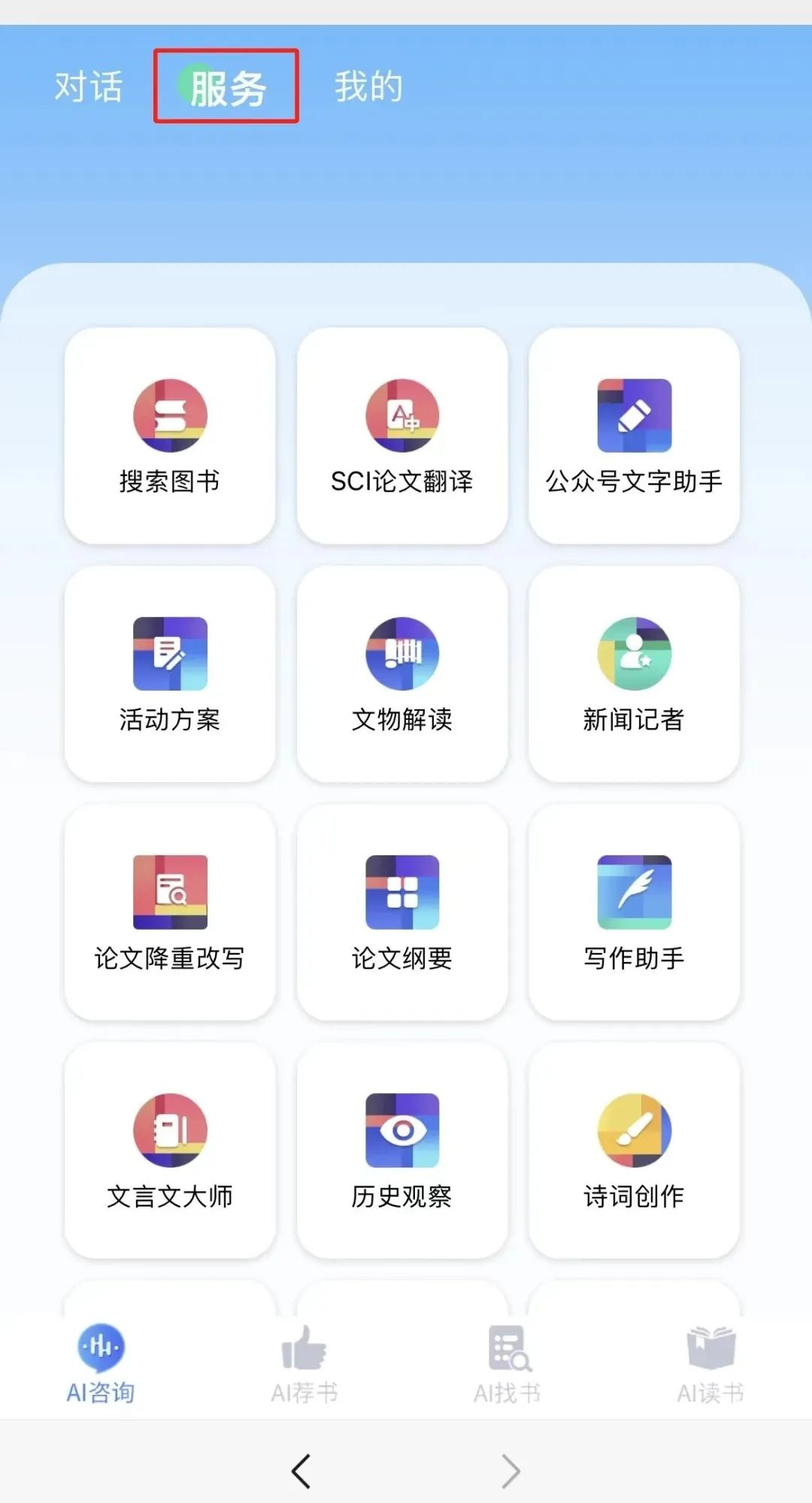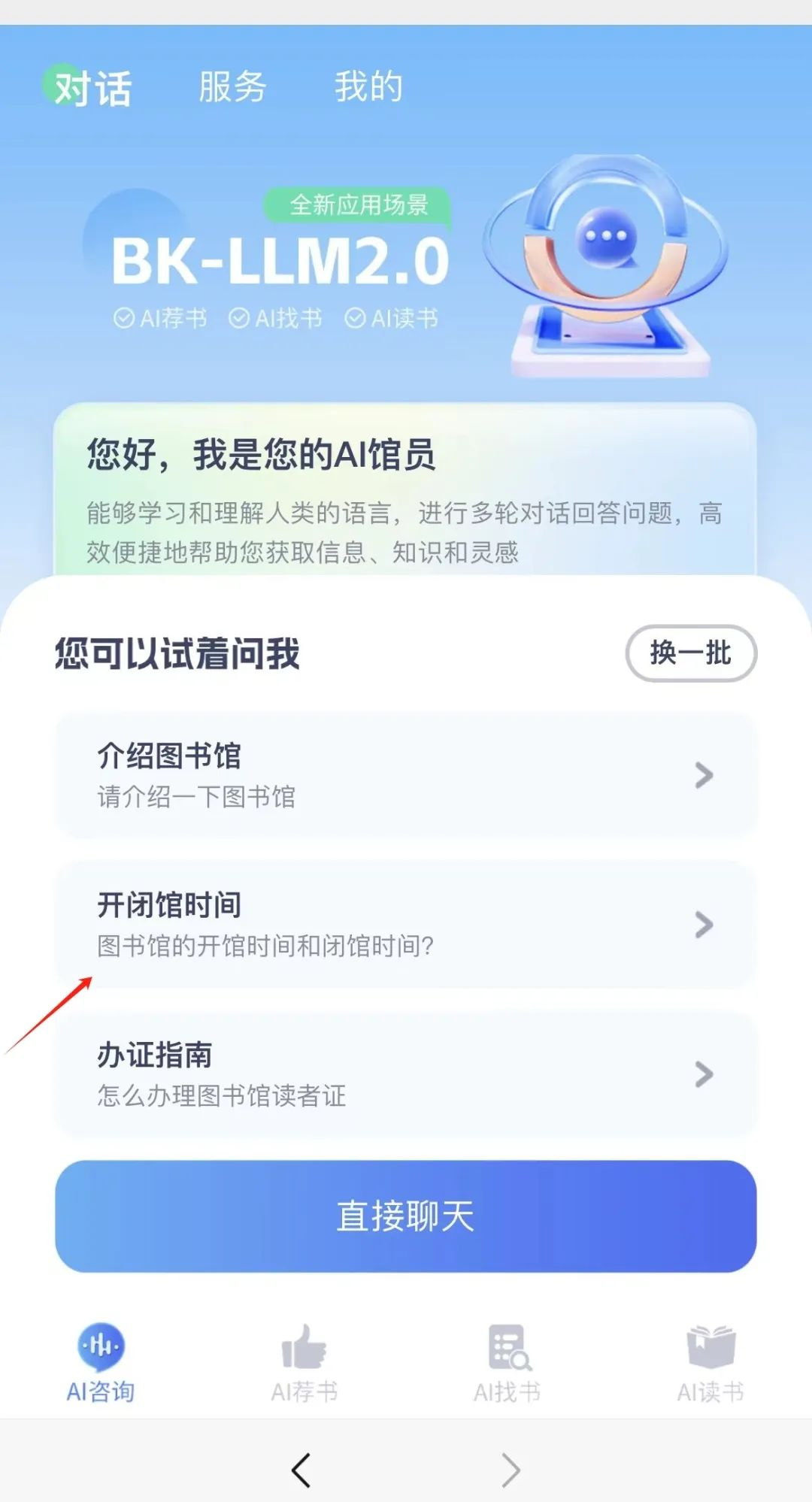 AI馆员通过融合人工智能技术和大数据算法,构建出强大的语义理解、逻辑推理以及自然语言处理能力。借助对图书馆海量私有文本数据和博看数字书刊资源的深度学习与训练,该模型能够为读者提供高度精确的检索服务以及馆内信息支持。如:AI咨询、AI荐书、AI找书、AI读书等服务。