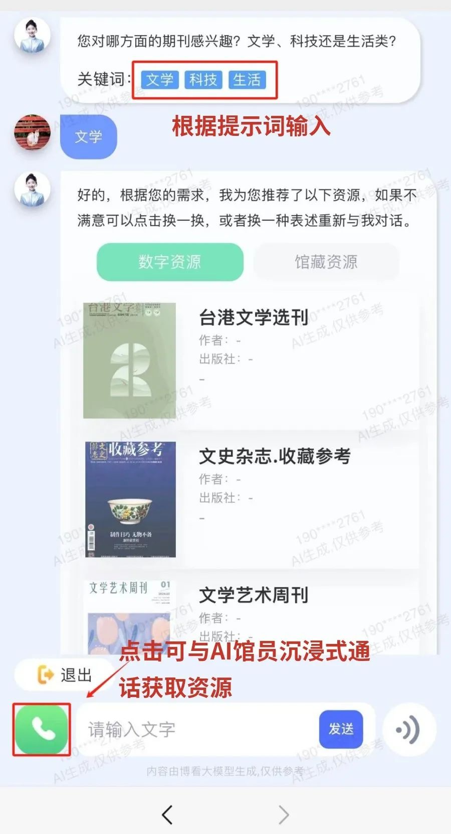 只需向AI馆员表达阅读需求,或通过左下角“通话”按钮,与博看AI多轮拟人化语音对话,精准推荐用户感兴趣的阅读资源。