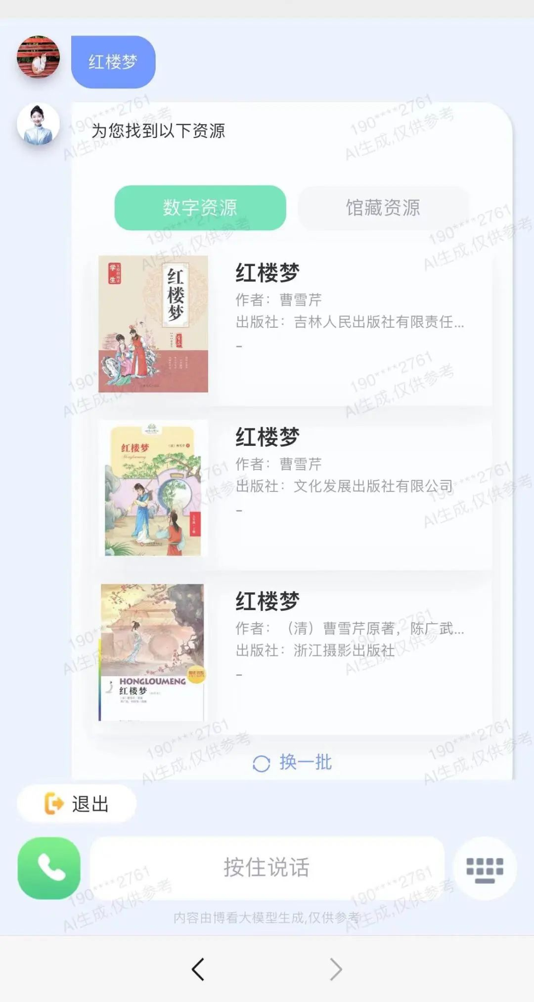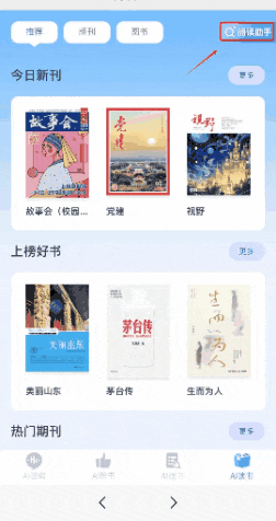 点击“AI”按钮,即可和AI助手沉浸式通话,语音输入你想要的资源类型/书名/作者,快速定位资源。