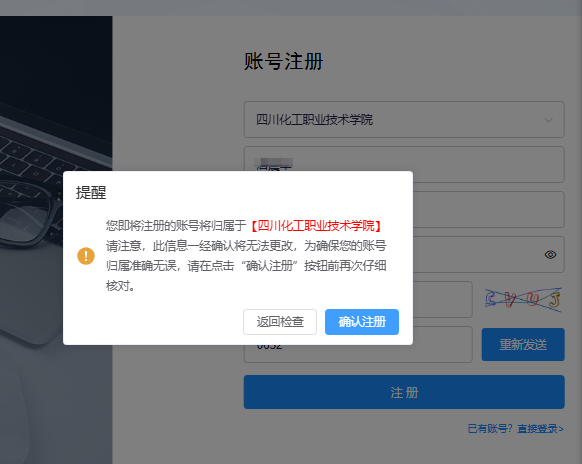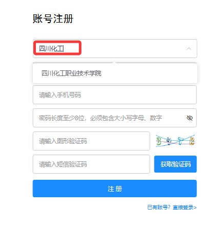 在“学校或公共机构名”框中输入“四川化工”,会弹出来“四川化工职业技术学院”,点击;