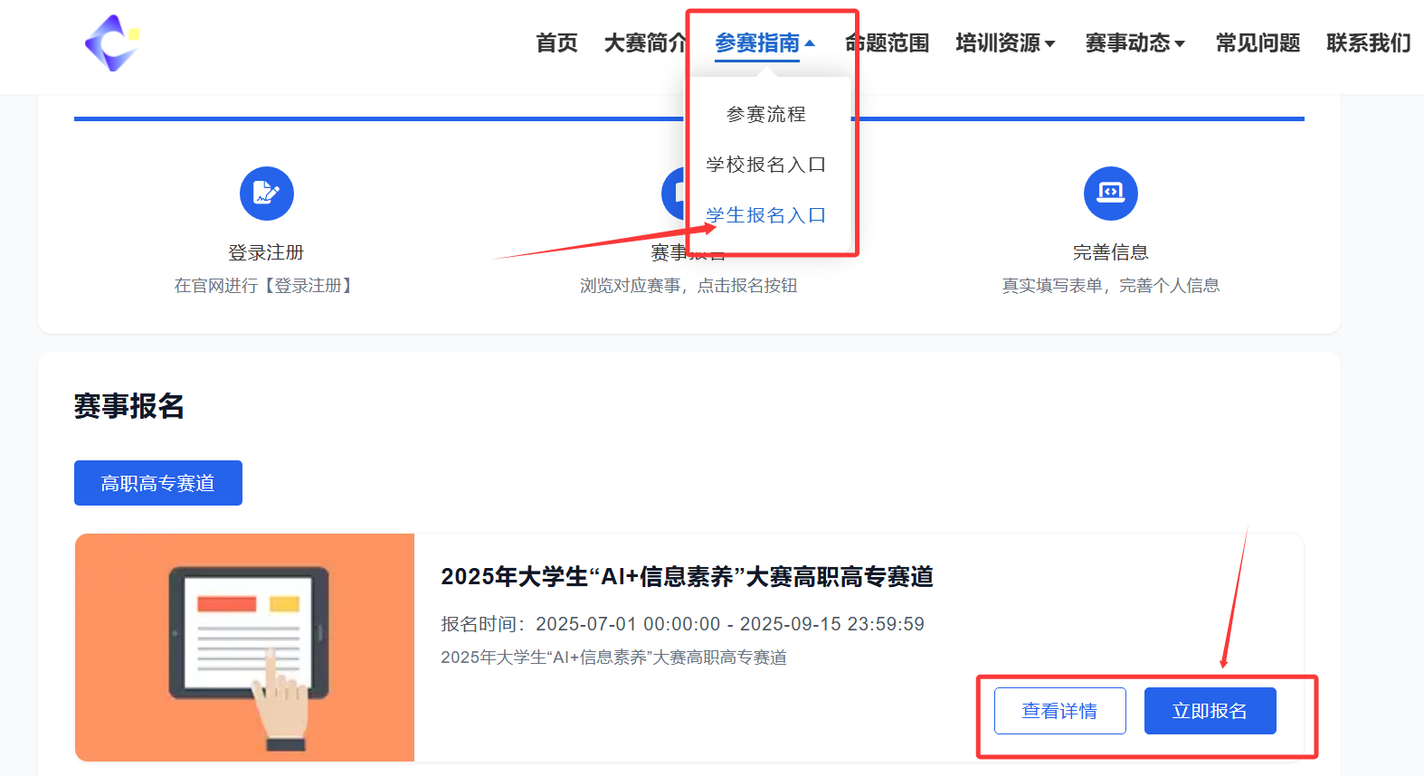 信息注册完成后,需登录报名。在网页最上面的标题栏中选择“参赛指南”,在下拉菜单中选择“学生报名入口”,即可看到2025年大学生“AI+信息素养”大赛高职高专赛道报名入口,点击“立即报名”。