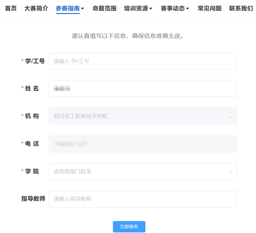 点击“立即报名”,认真填写报名信息,学号和学院,“院系”请写全称,如“数经学院”应写作“数字经济学院”,指导教师统一先不填写。