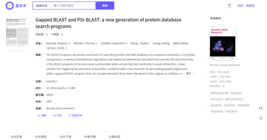 EA学术资源库涵盖了13万种外文期刊、1.6亿条外文文献数据、26亿条引文数据,提供7000万篇全文下载。全面覆盖科技、医学、农业、交通、航空航天、社会科学、艺术与人文科学等全球研究成果。资源库使用大数据分析和人工智能(AI)技术,将散落于互联网中的外文文献信息进行汇聚整合,并对海量文献数据进行深度挖掘、精准提炼、关联分析和精细加工后形成了高质量外文文献数据库和自有引文网络数据库。该数据库利用人工智能分析引擎对高引用文章和经典文献进行文献总结,从而更好地辅助读者对学术文献的理解和利用,极大提升科研效率。